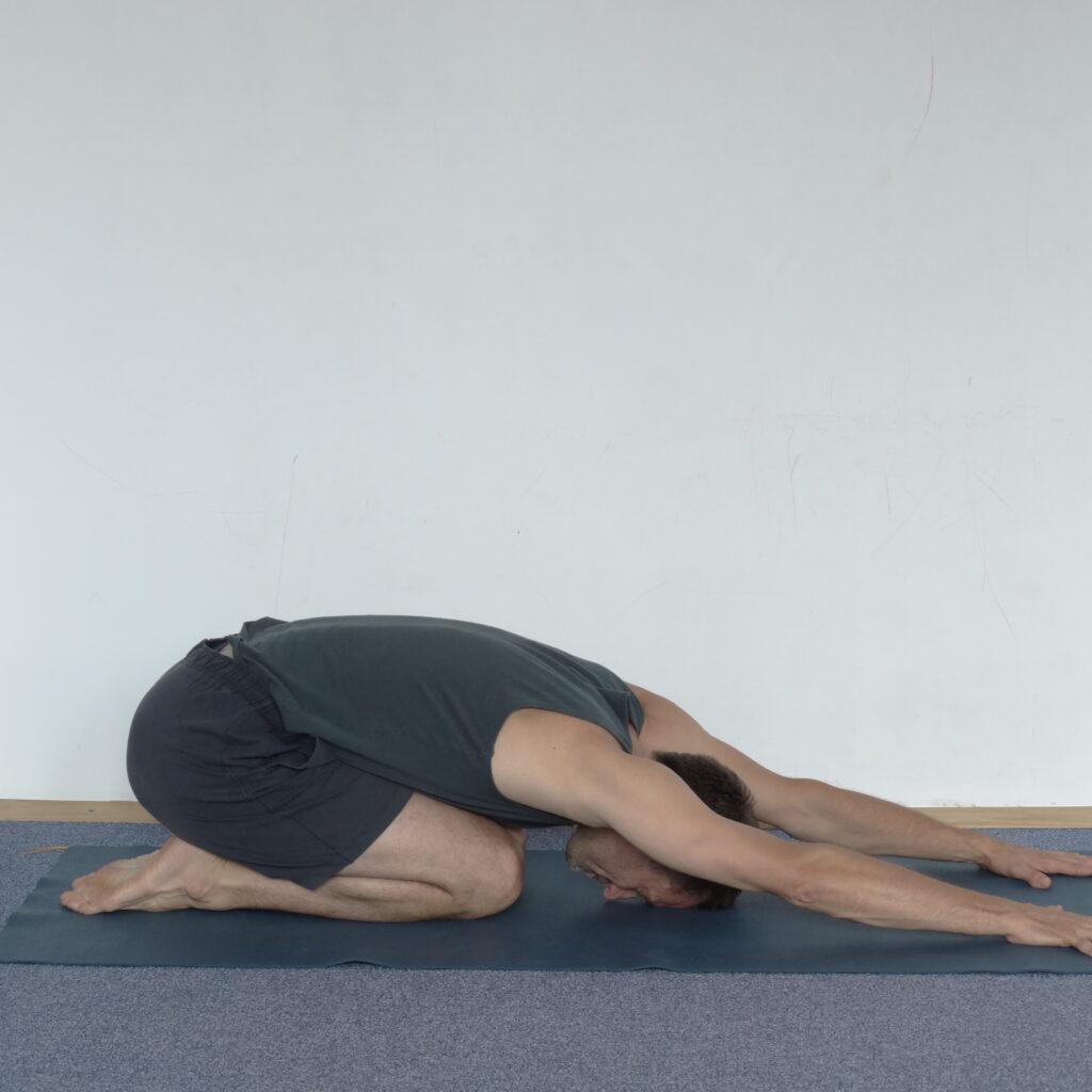 2. Wyciągając przód tułowia oprzyj brzuch na udach a czoło na podłodze.