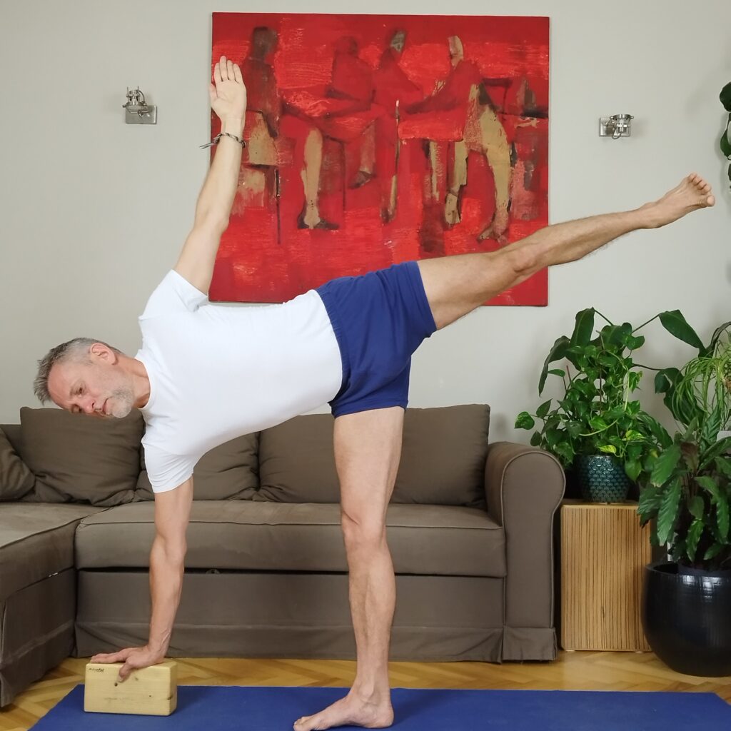 4. Podnieś lewą nogę do wysokości bioder, następnie wyprostuj prawą nogę i prawy łokieć.